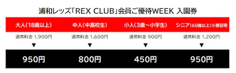 浦和レッズの公式メンバーシップ「REX CLUB」の会員は、期間中に会員証(デジタル可)をチケット販売窓口で提示することで、優待価格での入園が可能となる。