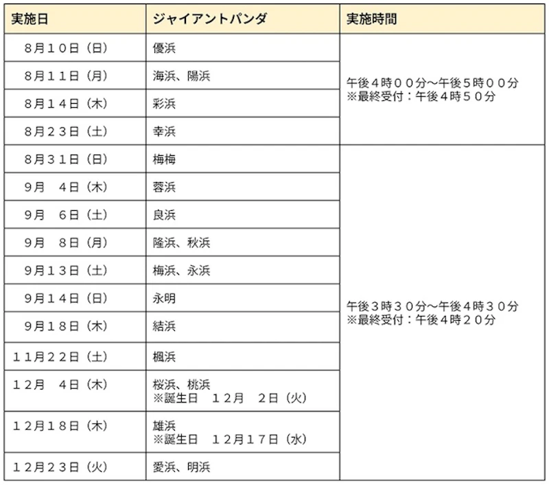 内容:これまでパンダたちが過ごしてきたブリーディングセンターの屋外運動場を歴代のエデュテイナー(飼育スタッフ)によるガイド付きで特別に入場することができます。