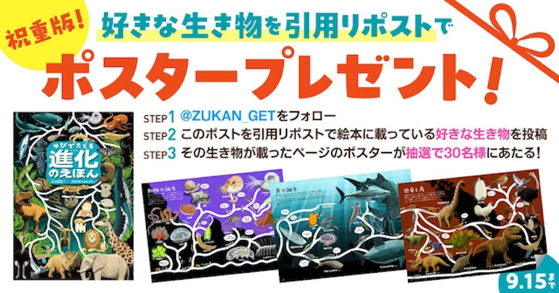 Xでキャンペーン対象投稿に「絵本に載っている好きな生き物」を書いて引用リポストすると、その生物が掲載されているページのポスターが抽選で30名様にあたります。