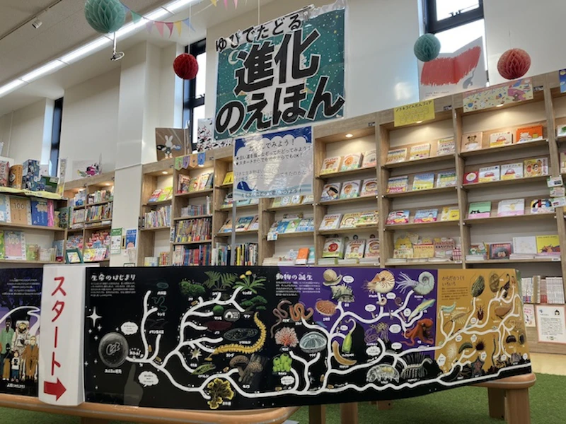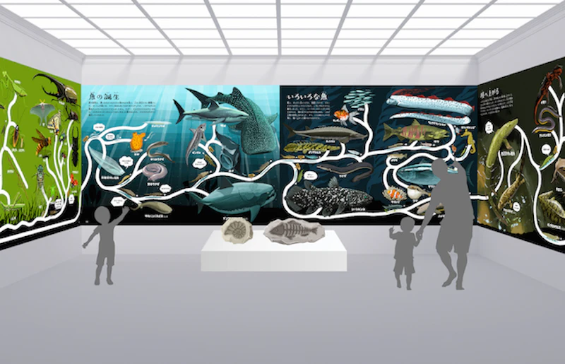 絵本のページを横につなげて張り合わせることで、進化の道がページをまたいでつながり、歩きながら眺めて楽しめるパネル展示になります。パネルにあわせて標本や化石などを展示いただくことも可能です。