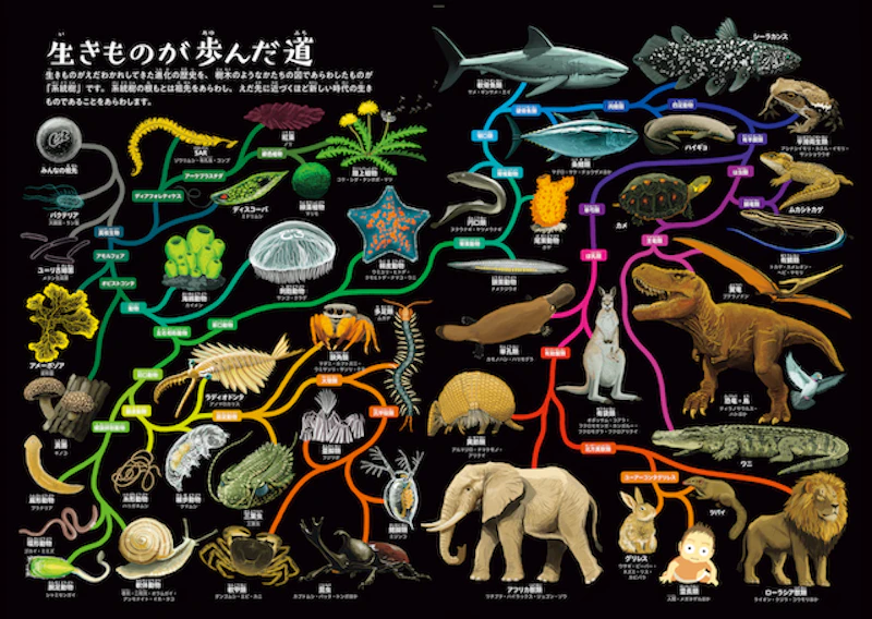 『ゆびでたどる進化のえほん』のなかの、すべての生きものの分類がわかる「生きものが歩んだ道」ページを拡大したポスターです。