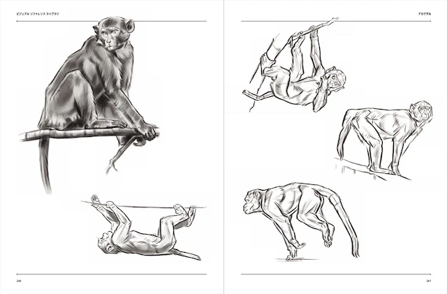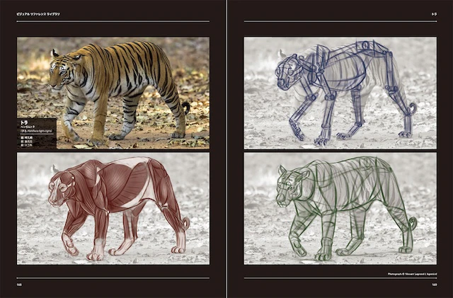 「ビジュアルリファレンスライブラリ」では、圧倒的な動物写真の数々にアーティストShannon Beaumont(シャノン・ボーモン)が骨格構造、筋肉組織、輪郭形態を詳細に重ねたイラストが収録されています。50体ほどの多様な動物の造形美を網羅した膨大なコレクションとなっています。