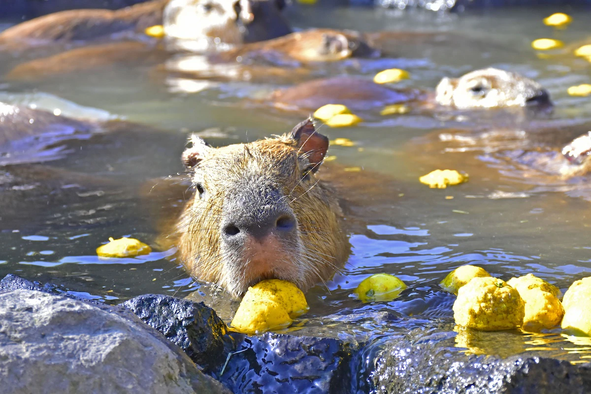 伊豆シャボテン動物公園では、2025年12月22日(月)の冬至に先がけて、12月20日(土)から2026年1月12日(月・祝)までの期間に「カピバラのゆず湯」が開催されます。なお、2026年1月7日(水)は「七草の湯」が実施されます。