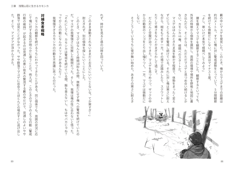 大学で野生動物研究室に所属した著者は、野生動物との出会いや恩師、フィールドワークの達人たちとの交流を通じて研究にのめり込みます。単独の観察からチームでの研究へと視点が広がっていく過程は、カモシカたちの変化とも重なり、本書の大きな魅力となっています。