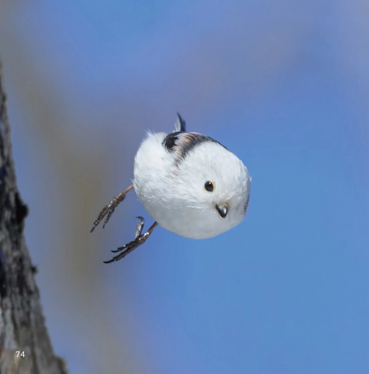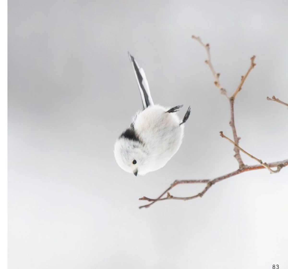 北海道の凍てつく風の中でも元気に活動するシマエナガたちの姿が収められています。体をキュッと縮めて飛び立つシマエナガの姿は、まさにロケットのようだと表現されています。