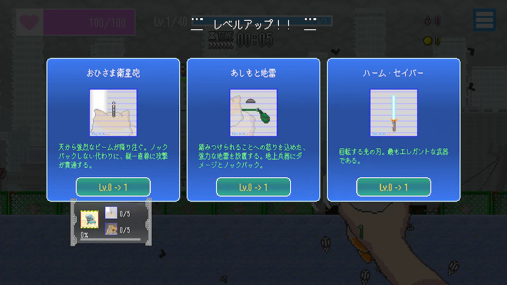 ゲームのメインパートは、タワーディフェンスと育成(そして、もちおを可愛がること)で構成されています。右手にもちおを握り締めて敵に照準を合わせ、侵攻してくる敵を迎撃します。撃破した敵が落とす「種」を回収して経験値を獲得し、レベルアップ時にはランダムに提示されるスキルを選択します。戦闘の中でもちおを強化しながら、防衛ラインを死守することが求められます。