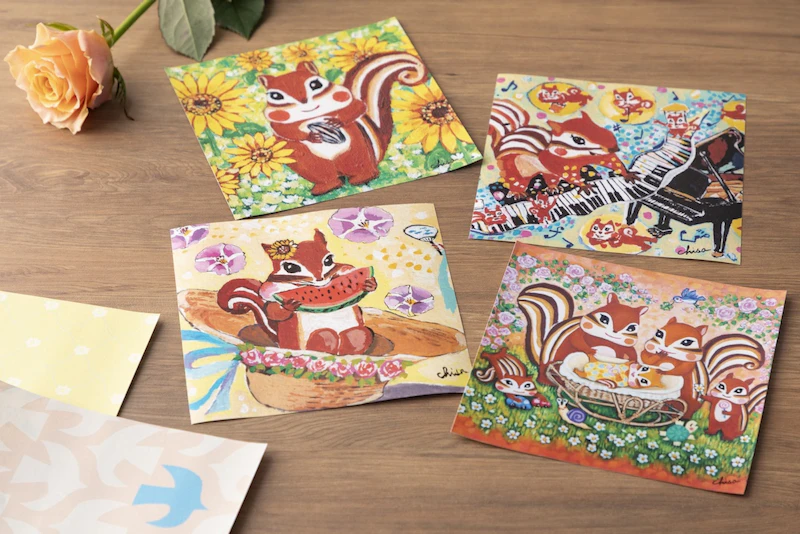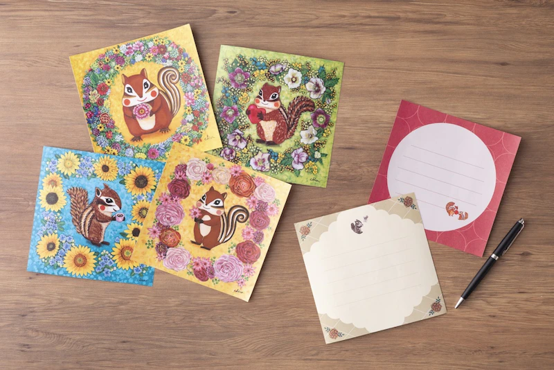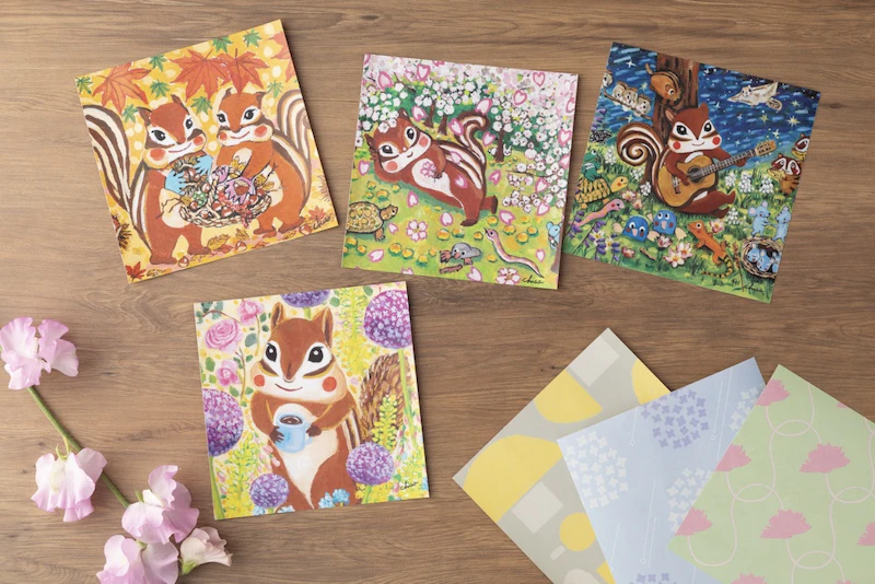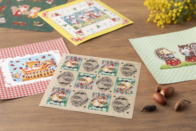 1枚1枚異なる絵柄のおりがみには、四季をまとったリスたちの優しい世界が広がります。大切なひとを思いながら、おりがみに一言添えて、気持ちをそっと折りたたむことができます。