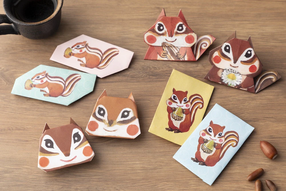 遊び心のある絵柄も愛らしく、パラパラとめくるだけでも笑顔に!折ったらリスになる絵柄も収録