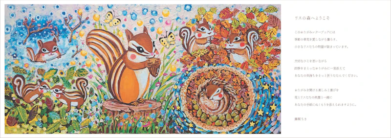 本書は、お菓子のパッケージデザインなどで長年リスを描いてきた藤岡ちささんによる、40絵柄のおりがみと小さなリスたちのおはなしが詰まったおりがみ型のレターブックです。