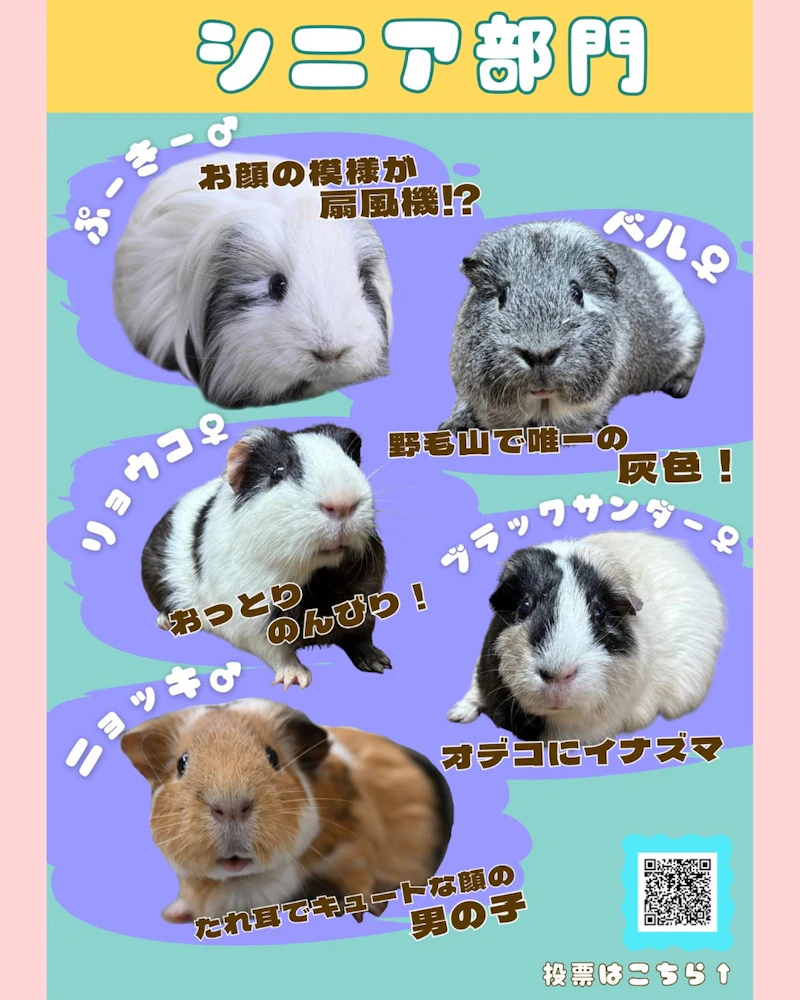 年齢を重ねた、なかよし広場でも頼れる存在のベテランモルモットたちが集まる「シニア部門」。立候補モルは以下の5頭です。