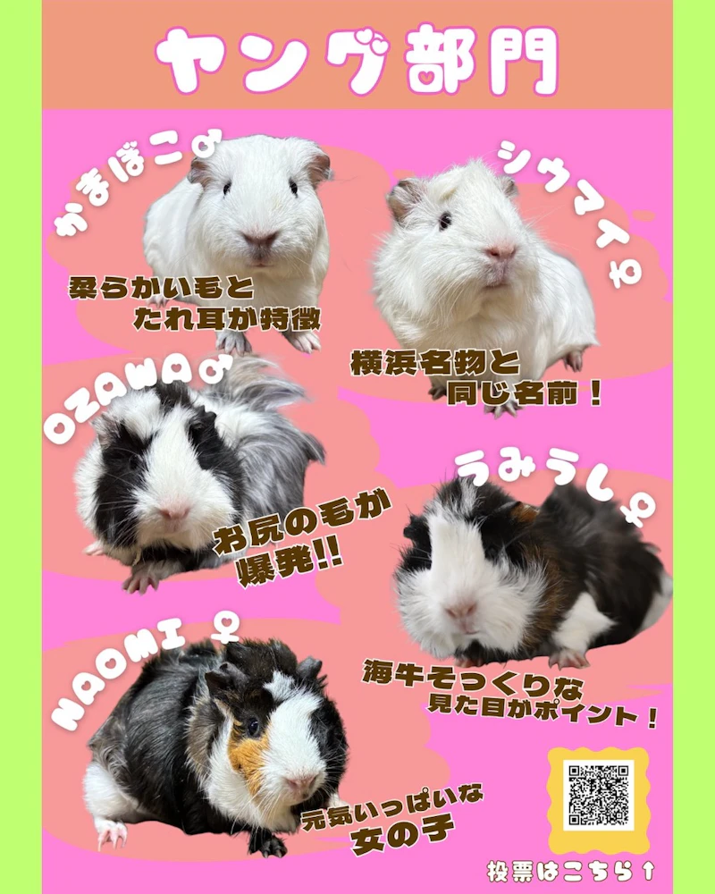 元気いっぱいで、なかよし広場のこれからを引っ張る若手モルモットが揃う「ヤング部門」。立候補モルは以下の5頭です。
