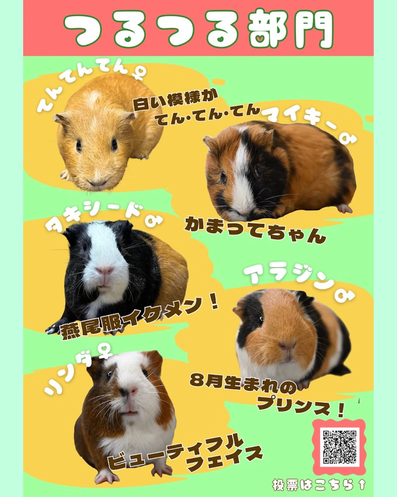 なかよし広場で暮らすモルモットたちを毛質や年齢ごとに5つの部門に分け、各部門5頭ずつ、合計25頭がエントリー。Googleフォームから投票できます。