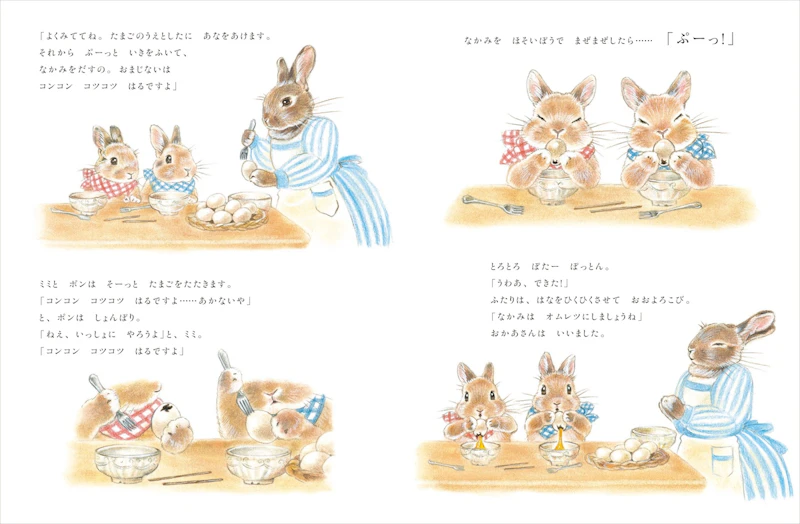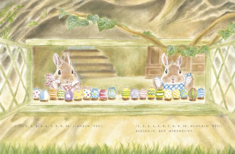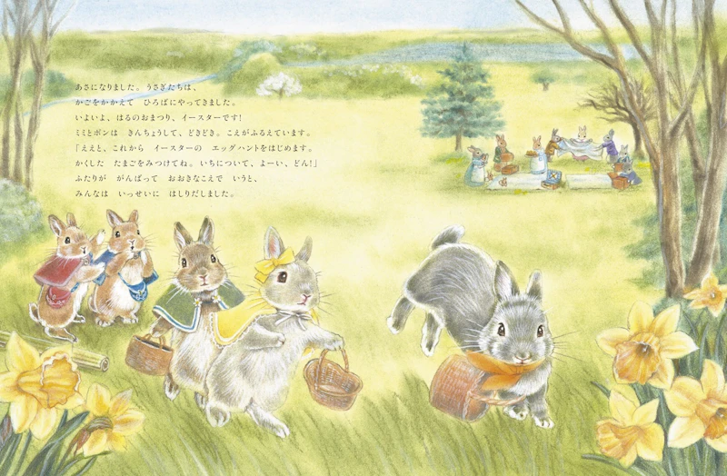 物語の舞台は、春を迎えたうさぎの森です。ふたごうさぎのミミとポンは、今年初めて「イースターうさぎ」の当番を任されます。2匹はイースターエッグを作ったり、エッグハントの準備をしたりと大忙しです。
