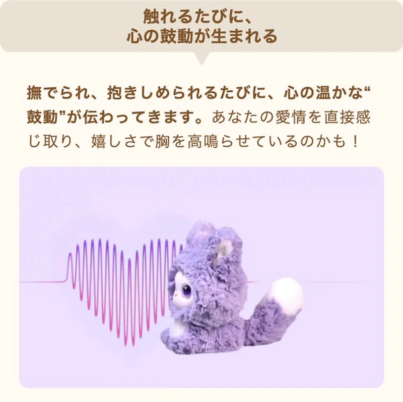 iMoochiの体には、頭・背中・左右の足・鼻の5箇所にタッチセンサーを搭載。軽く撫でると嬉しそうに目を細め、抱きしめると心の温かな"鼓動"が伝わってきます。放っておくと不満そうな表情になったり、体を前後に揺らすと目がまわってしまったりと、リアクションはまるで本物のペットのよう。