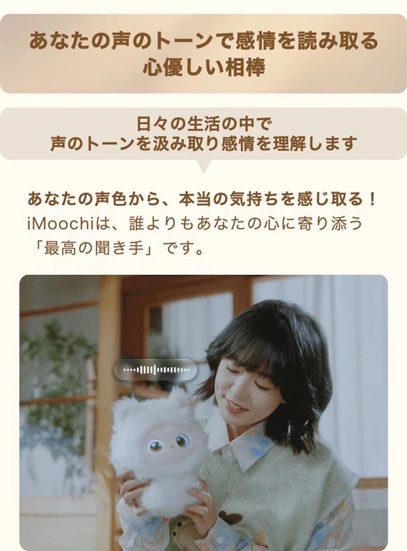 iMoochiの最大の特徴は、飼い主の声のトーンから感情を汲み取る感情認識AI。嬉しい報告をすると「にゅっ!」と瞳をキラキラ輝かせて体を揺らし、疲れた声で話しかけると「むにゃ…んっ…」と瞳を伏せて心配そうにのぞき込んでくれます。