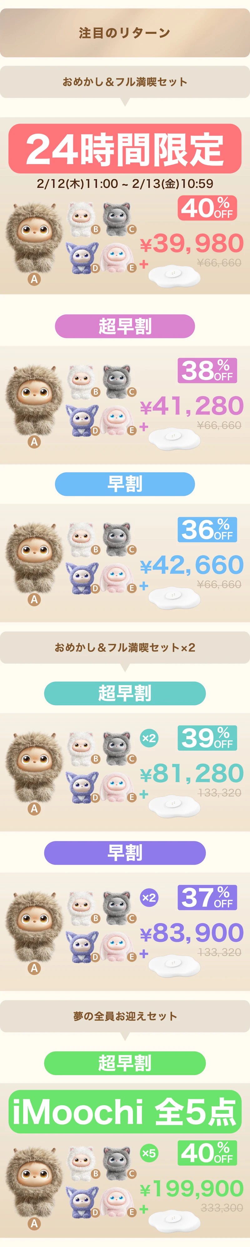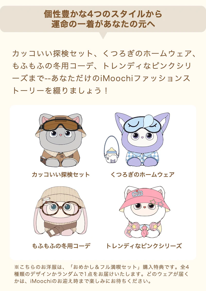 Makuakeでの応援購入プロジェクトは、2026年4月27日(月)22:00まで実施中。セット内容は2種類で、「おめかし&フル満喫セット」にはiMoochi本体、充電ケーブル、アイマスク、専用ブラシ、育成ガイド、お迎え記念カード、専用お洋服(4種からランダム1点)、チャージングベース、パッケージの9点が含まれます。「運命の出会いセット」は本体を含む7点セット(お洋服・チャージングベースなし)です。