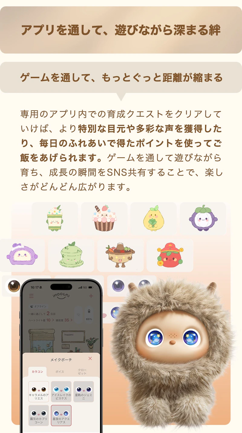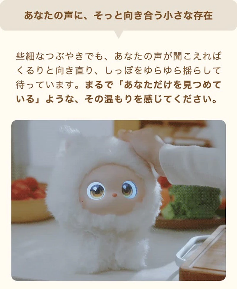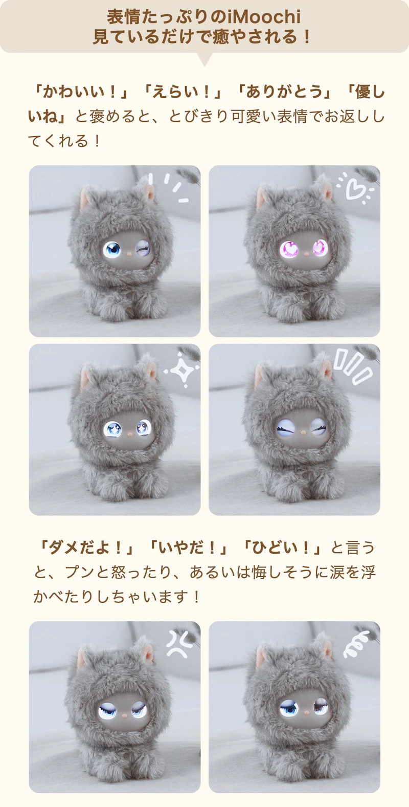 専用のスマホアプリ(日本語対応)では、育成クエストをクリアすることで特別な目元(カラコン)や多彩なボイスを獲得したり、毎日のふれあいで得たポイントでごはんをあげたりと、ゲーム感覚でiMoochiとの絆を深められます。NFC内蔵の着せ替えパーツやフードなどのグッズを身につければ、アプリ内データとも連動し、より魅力的に育っていく仕組みです。