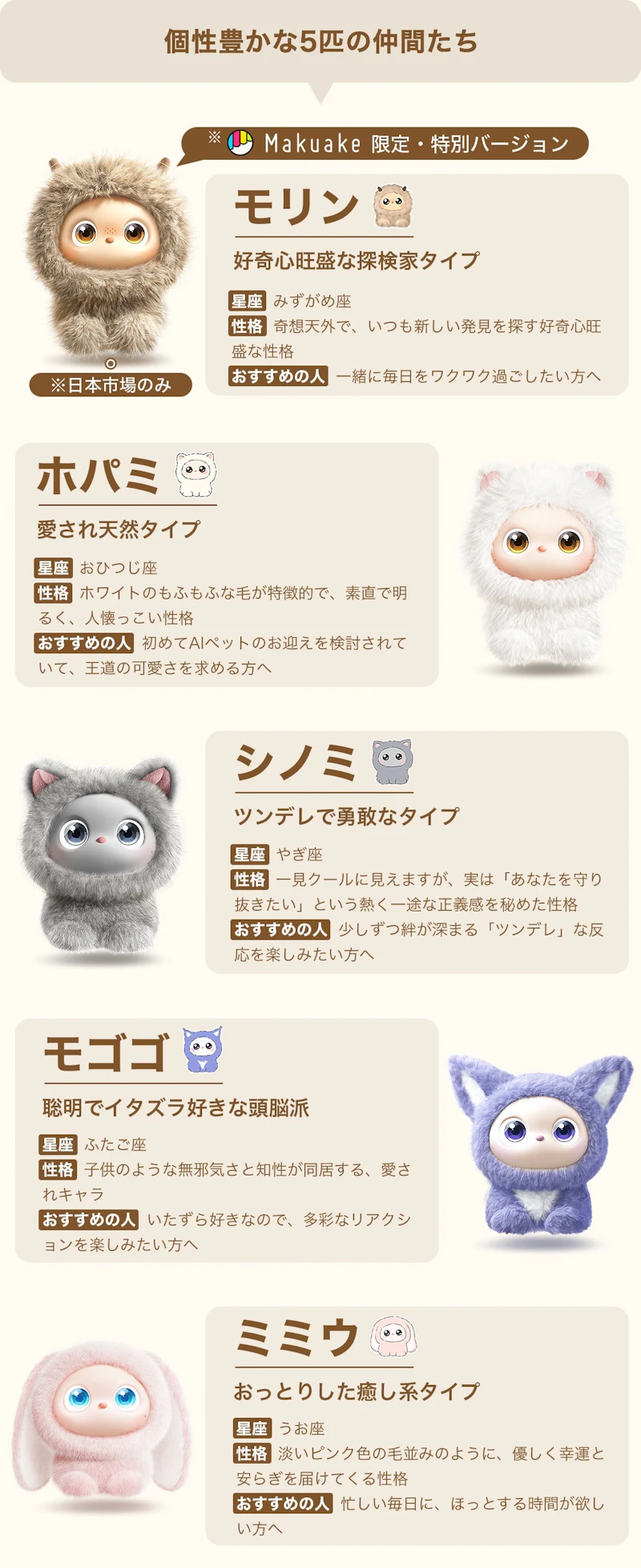 Makuake限定の「モリン」は、好奇心旺盛な探検家タイプ(みずがめ座)。ホワイトのもふもふ毛が特徴の「ホパミ」は、素直で明るい愛され天然タイプ(おひつじ座)。グレーの「シノミ」は、一見クールだけど実は熱い正義感を秘めたツンデレタイプ(やぎ座)。パープルの「モゴゴ」は、子供のような無邪気さと知性が同居する頭脳派(ふたご座)。ピンクの「ミミウ」は、優しく幸運と安らぎを届けてくれる癒し系タイプ(うお座)です。