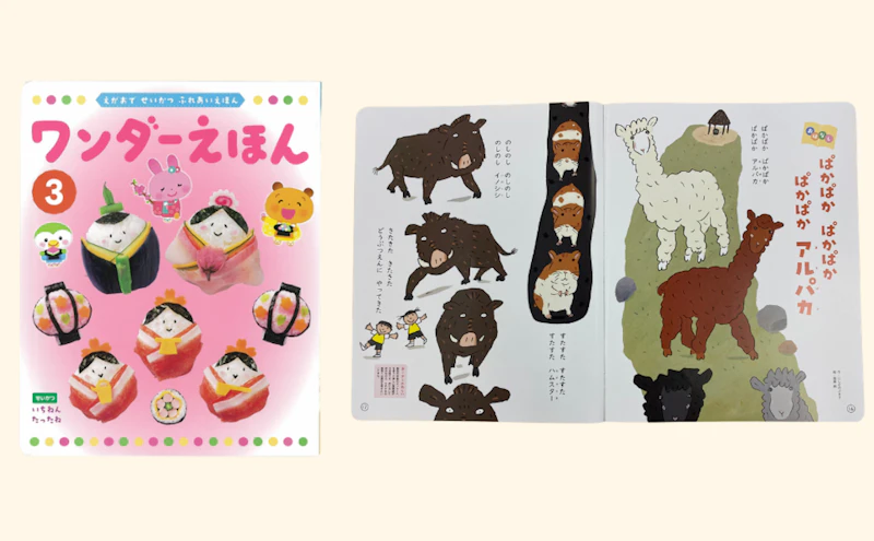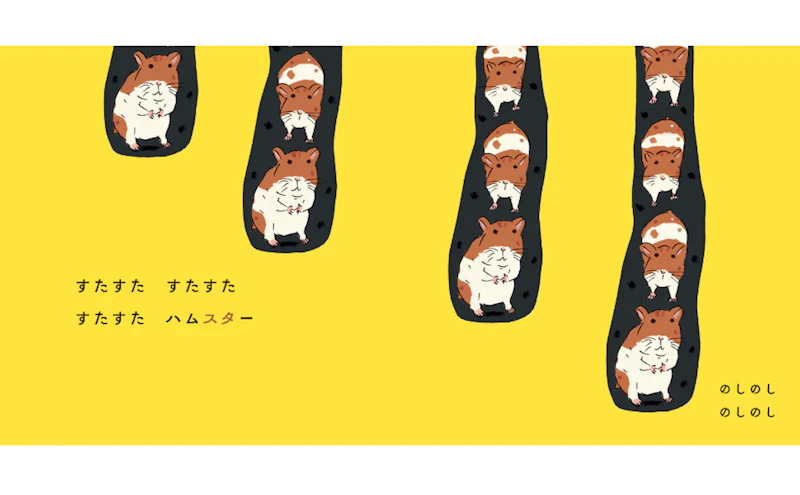 本作は、月刊絵本「ワンダーえほん」に掲載された作品に新規ページを加えて市販化したものです。ページをめくるたびにリズムが生まれ、子どもから大人まで声に出して読みたくなる内容に仕上がっています。ハムスターやアルマジロといった動物たちも、ゆかいなオノマトペとともに紙面に登場します。