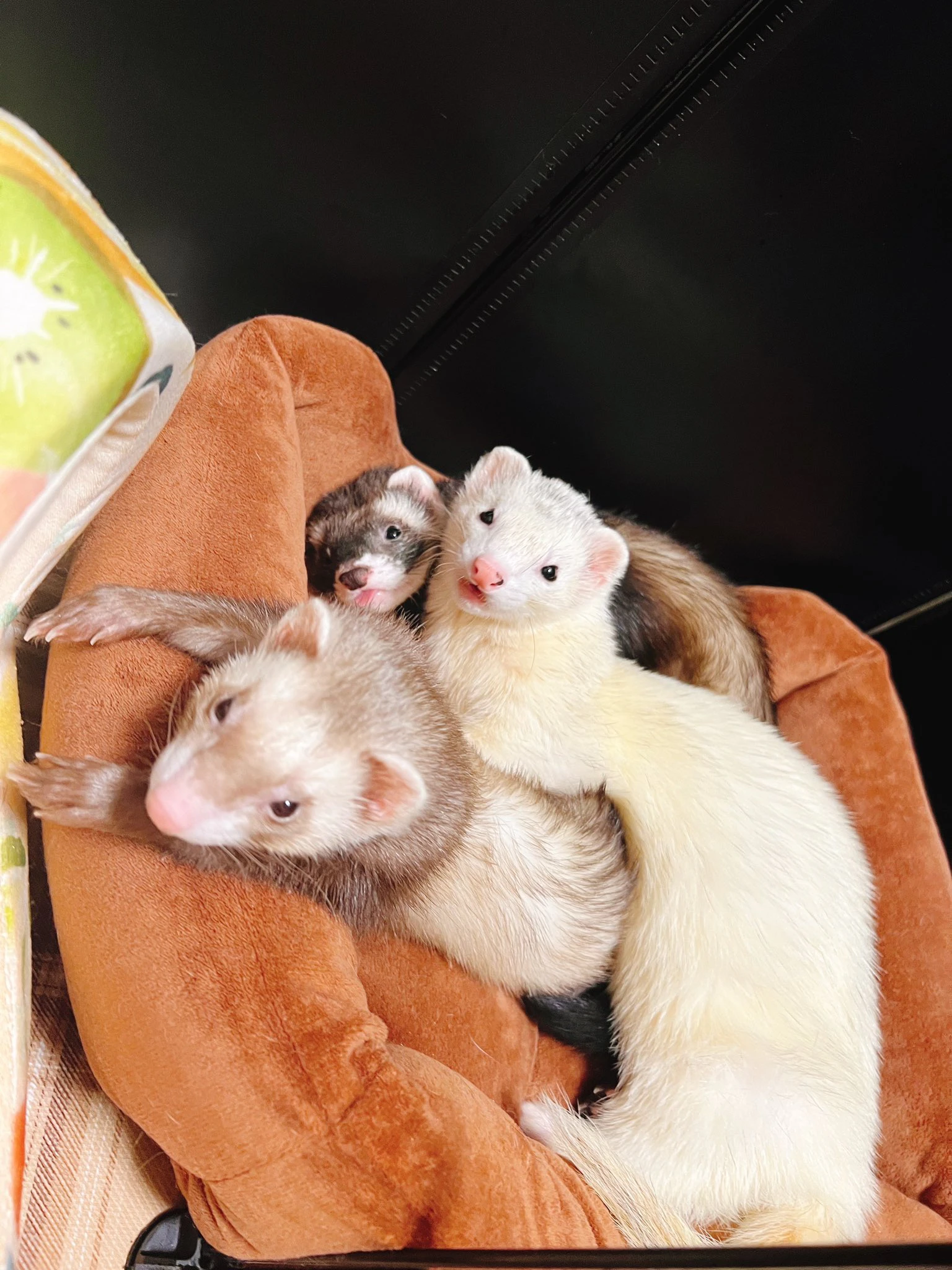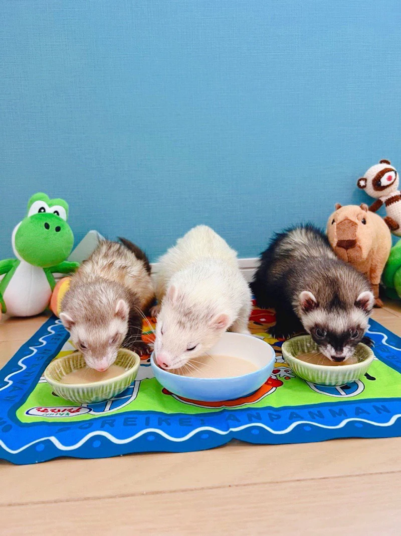 長女のもちこちゃん、長男のぎんがくん、末っ子のやしゃまるくんの3匹です。全員マーシャルフェレットですね。他にもミーアキャットとモルモットも一緒に暮らしています。