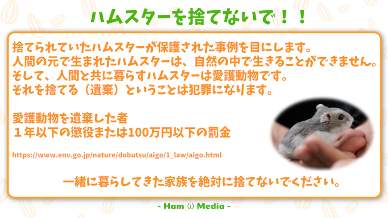警察経由の屋外で保護されたハムスターの大半は、様々な事情で飼育が難しくなり遺棄されたのだと思います。遺棄は犯罪であることを認識していただきたいです。