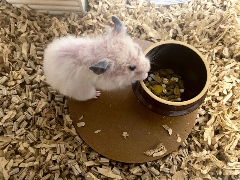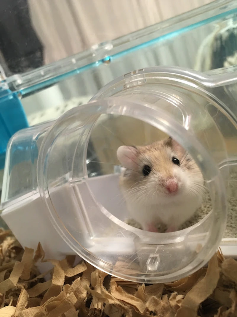 意外に思われる方が多いんですが、ロボロフスキーハムスターは体は小さいんですけど、とてもよく走るんです。本当にケージの中をずっと走り回るので、ジャンガリアンよりもむしろ広いスペースが必要なんですよ。うちの団体としては、ケージサイズはゴールデンと同じで60cm以上を推奨しています。