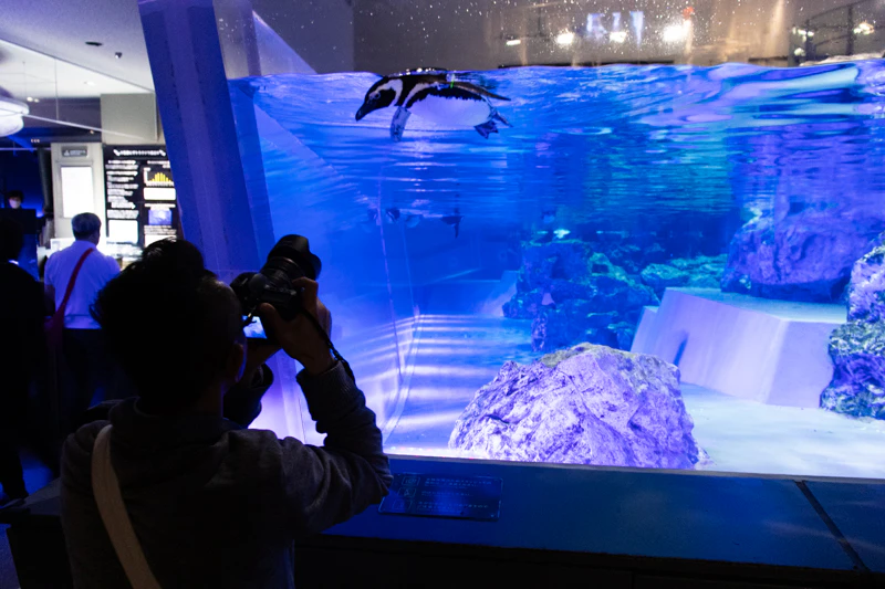 イベント終了後、参加者たちは閉館後のペンギンエリアで、篠田さんのアドバイスを参考にしながら撮影を楽しみました。
