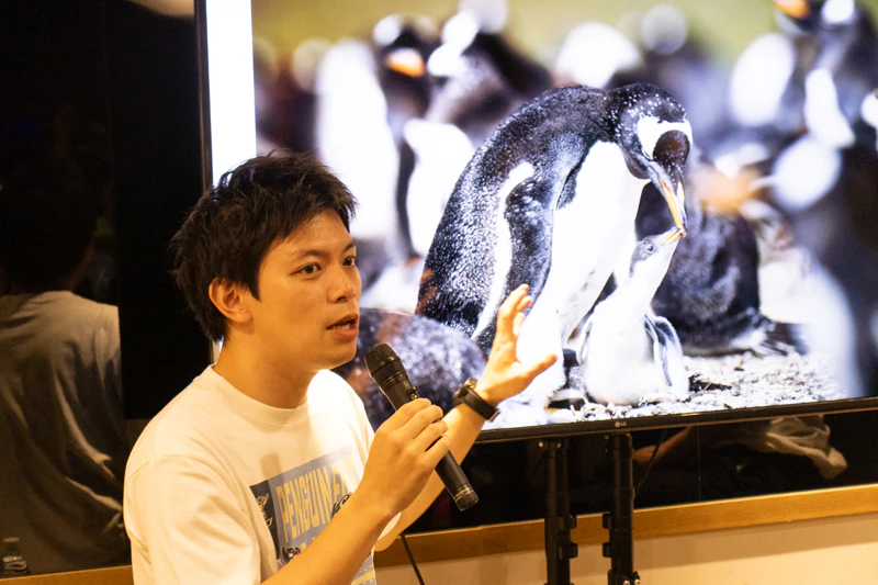 イベントは副館長の柿崎さんの挨拶から始まりました。柿崎さんは「ペンギンの魅力について、パッションを感じてもらい、より深く知ってもらおうという場を用意した」と述べ、「世界ペンギンの日はアデリーペンギンが南極基地に来たことから名付けられているが、すみだ水族館ではマゼランペンギンを飼育している。マゼランペンギンがどこに住んでいるか、どういう暮らしをしているかを知って、もっと好きになってもらえれば」と語りました。
